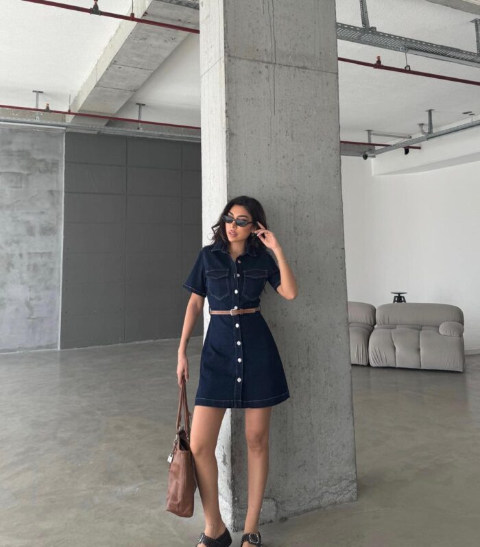 Önü Düğmeli Kısa Kadın Kot Elbise